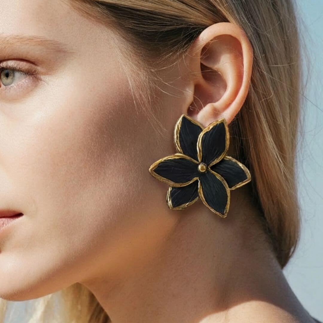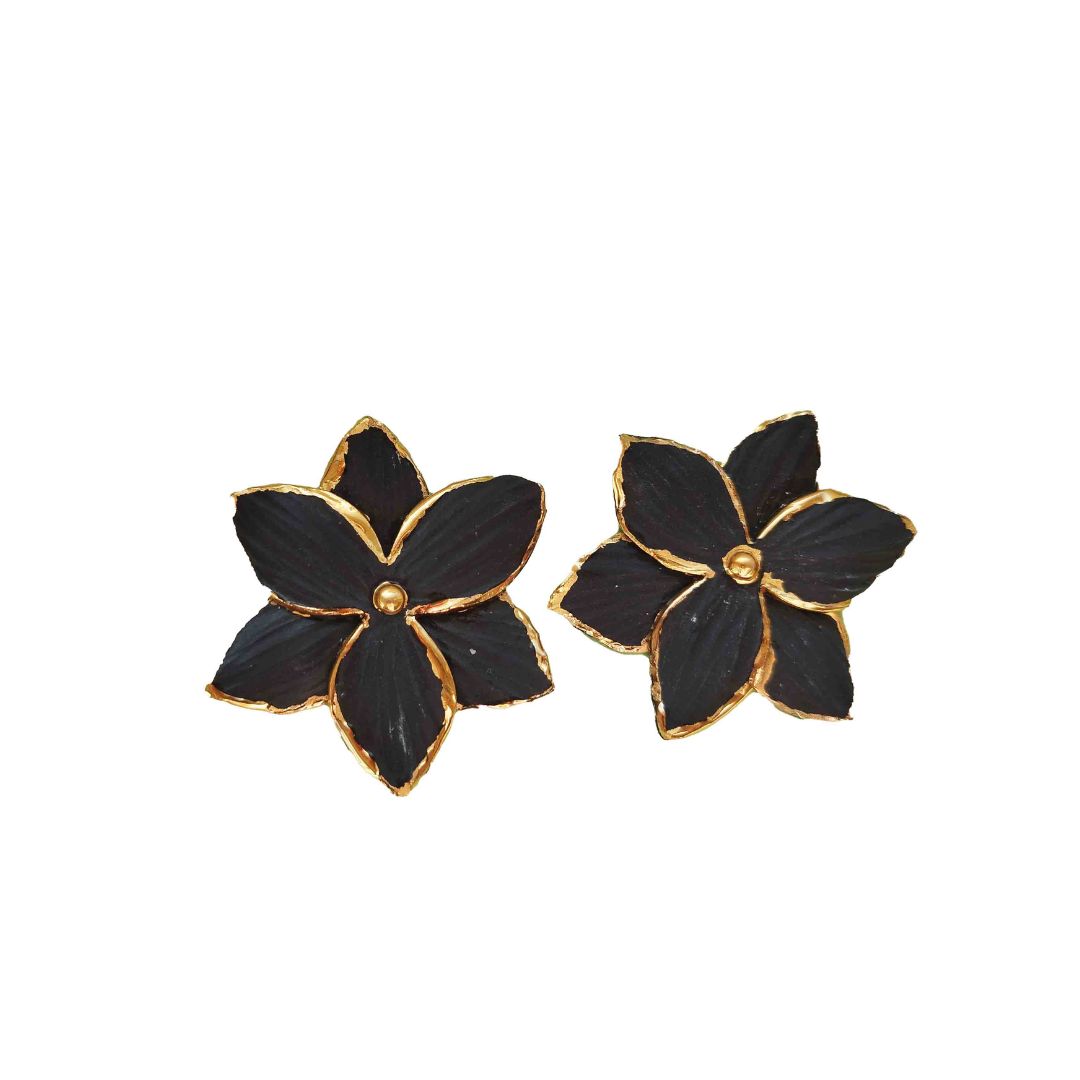 Gamtos įkvėpti elegantiški ir lengvi juodo porceliano auskarai, dekoruoti 12 karatų auksu. Tobulas balansas tarp estetikos ir natūralumo.