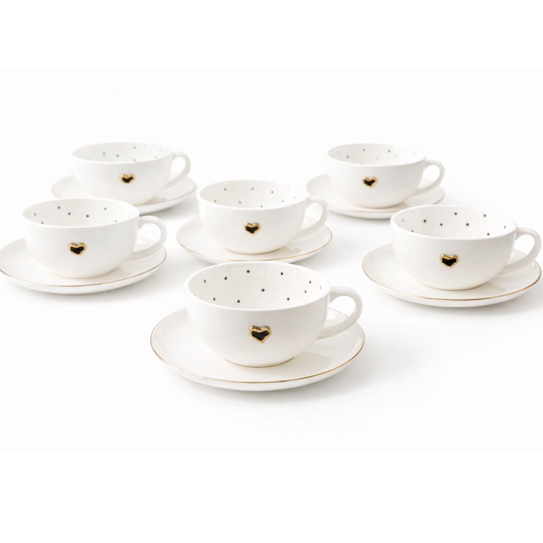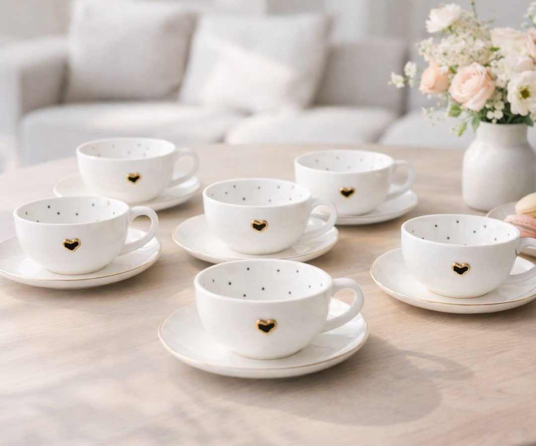 Naudojame tik aukščiausios kokybės porcelianą, kuris suteikia lengvumo ir ilgaamžiškumo. Kruopščiai apgalvotos detalės, tokios kaip subtilūs taškeliai puodelio viduje, paauksuota širdelė bei auksinis lėkštelės kraštelis, paverčia šį rinkinį ne tik praktišku, bet ir stilingu namų ir stalo akcentu. Puodeliai idealiai tinka tiek kasdieniam naudojimui, tiek atvykusių svečių vaišinimui ar ypatingoms progoms, kai norisi sukurti jaukią ir išskirtinę atmosferą.