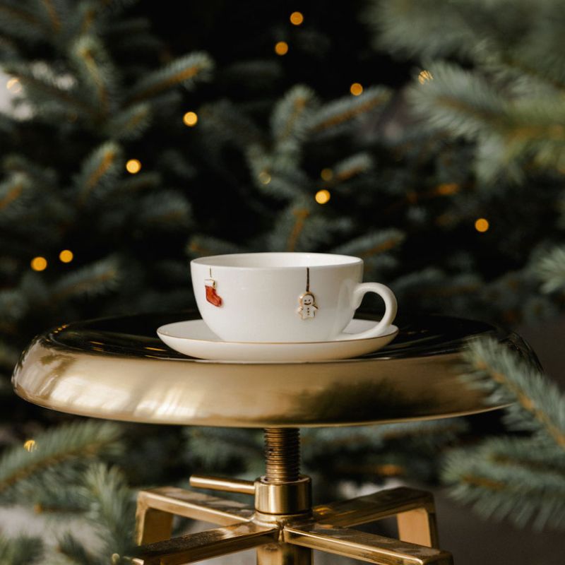 Šventiškas rankų darbo porcelianinis puodelis su kalėdiniais elementais, dekoruotas tikru auksu. Šis derinys suteikia puodeliui tiek žaismingumo, tiek elegancijos. Porcelianinis rankų darbo Kalėdinis puodelis su lėkštute yra tobula dovana visiems, kurie Kalėdas švenčia širdyje ištisus metus.