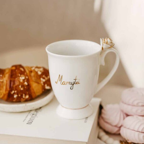 Puodelio „MAMYTEI“ dizainas išsiskiria savo subtilumu ir elegancija. Rankų darbo gėlė, dekoruota auksu, suteikia puodeliui ypatingo žavesio ir prabangos. Gėlė simbolizuoja tyrumą ir rūpesti, kas puikiai tinka išreikšti jūsų dėmesingumą mamai. Puodelio užrašas „MAMYTEI“ yra švelnus priminimas apie jūsų dėkingumą ir pagarbą savo brangiausiam žmogui.