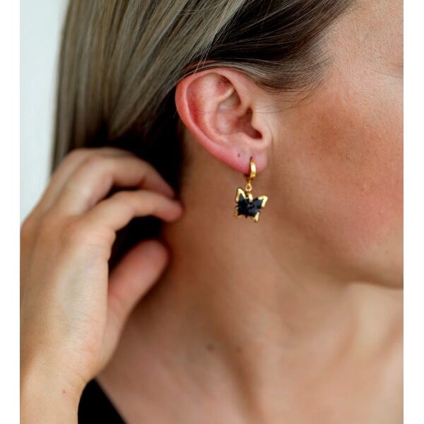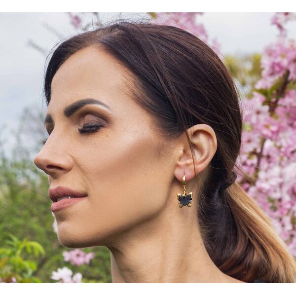 Žaismingi juodo porceliano auskarai su drugeliais. Porceliano auskarai yra kruopščiai pagaminti iš aukščiausios kokybės porceliano. Kiekvienas gaminimo etapas reikalauja daug atidumo, pirmiausiai jie yra suformuojami ir išdegami, vėliau glazūruojami ir grąžinami į krosnį, nuglazūruoti auskarai dekoruojami ir dar kartelį degami 780 laipsnių temperatūroje.