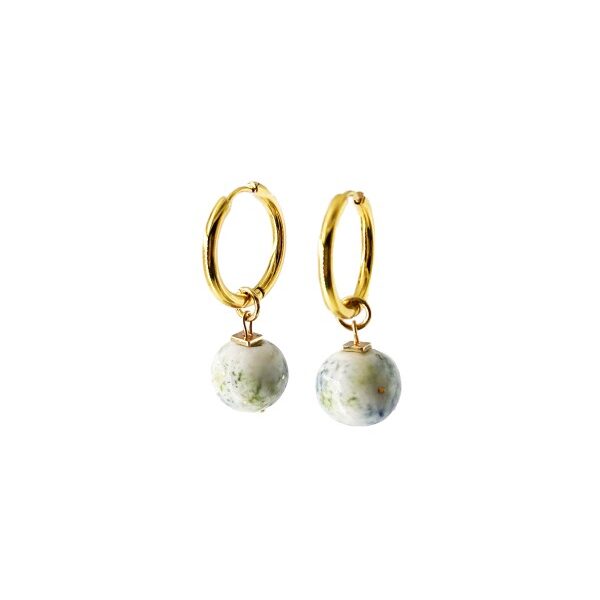 Elegantiški Hoop auskarai iš nerūdijančio plieno su žaismingu porcelianiniu burbuliuku, dominuoja – mėlyna, žalia, balta spalvos, šiek tiek aukso akcento. Šie auskarai yra lengvi, tad patogūs dėvėti bei suteikia jūsų įvaizdžiui žavesio ir žaismingumo. Šie auskarai puikiai tiks moterims, norinčioms pabrėžti savo individualumą.