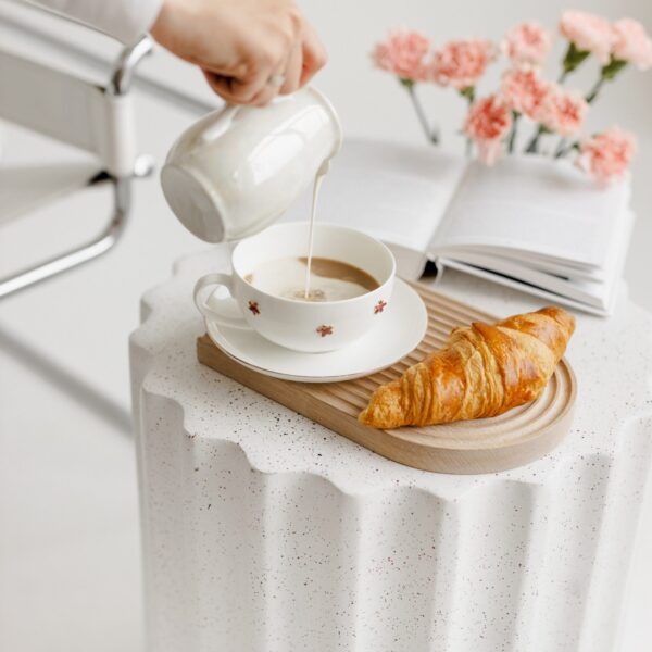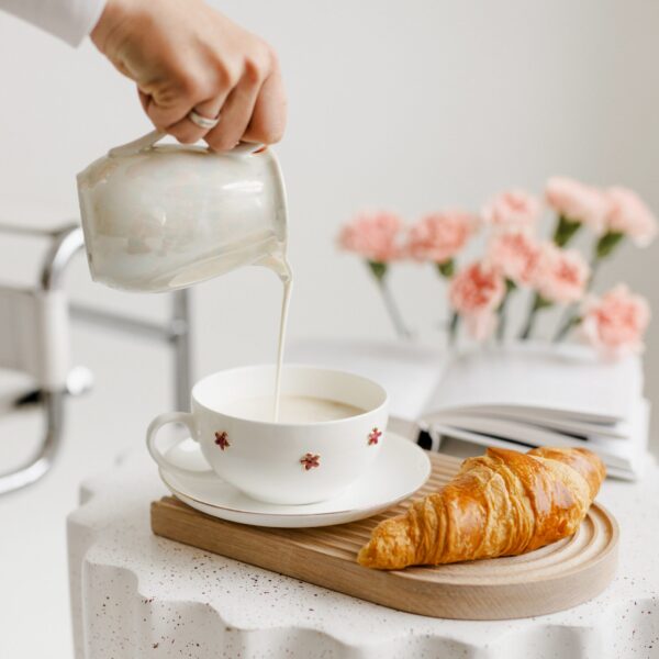 Lėkštutės paauksuoti krašteliai subtiliai papildo komplektą. Kiekvienas rinkinys – unikalus meno kūrinys, sukurtas su meile ir dėmesiu detalėms.